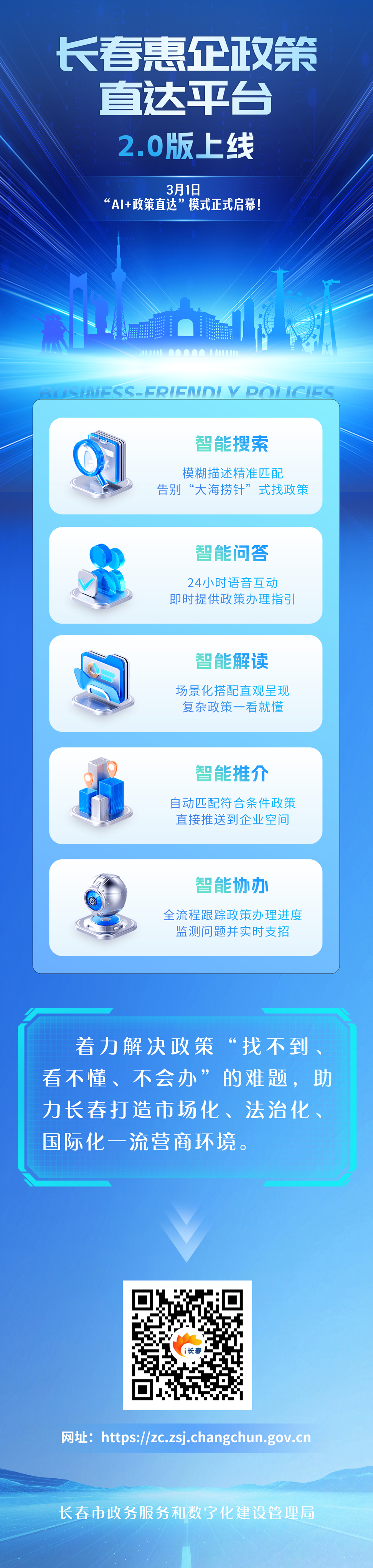 長春市政數(shù)局營商環(huán)境服務(wù)處二級調(diào)研員傅強(qiáng)介紹,2021年,長春惠企政策直達(dá)平臺(tái)1.0版上線。經(jīng)過五年實(shí)踐打磨完成全面升級,2.0版主打大數(shù)據(jù)+人工智能技術(shù),從企業(yè)視角打造AI應(yīng)用場景,讓企業(yè)輕松找政策、方便辦政策。