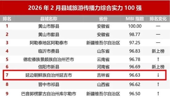 近日,邁點(diǎn)研究院獨(dú)家發(fā)布2026年2月縣域旅游傳播力綜合實(shí)力100強(qiáng)榜單,延吉市強(qiáng)勢(shì)上榜,位列第7名。