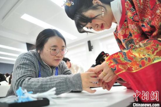 1月23日,巫珮瑄(左)在吉林長春學習制作漢服手工仿絨花雪花胸針。