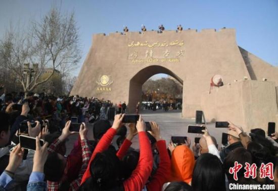 圖為來自五湖四海的游客在喀什古城觀賞開城儀式。 孫亭文 攝