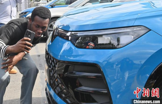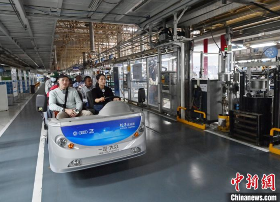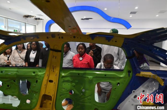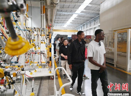 5月23日,吉林長春,留學生在和汽車合影。當天,二十余名留學生走進一汽-大眾長春生產(chǎn)基地,近距離感受中國汽車制造業(yè)的智能化發(fā)展。中新社記者 張瑤 攝
