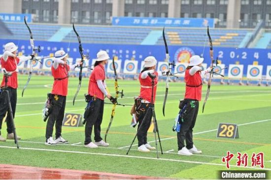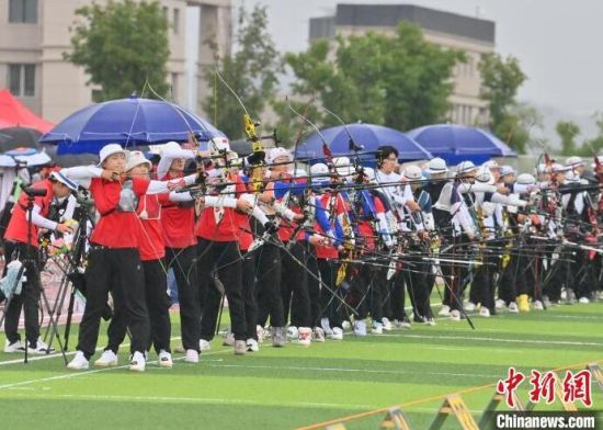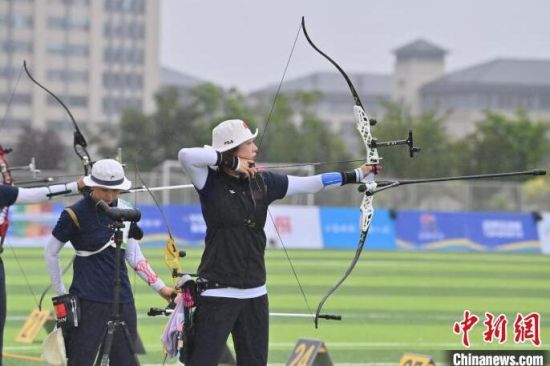 7月3日,吉林遼源,參賽選手參加女子個人70米輪賽。 當天,2024年全國射箭巡回賽暨全國射箭分站賽第二站在雨中開弓。來自全國各地的258名運動員在男子反曲弓個人、女子反曲弓個人、男子反曲弓團體、女子反曲弓團體、反曲弓混合團體5個競賽項目上一較高低。(中新社記者 張瑤 攝)