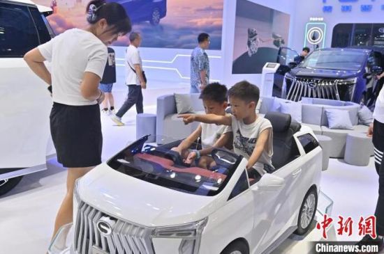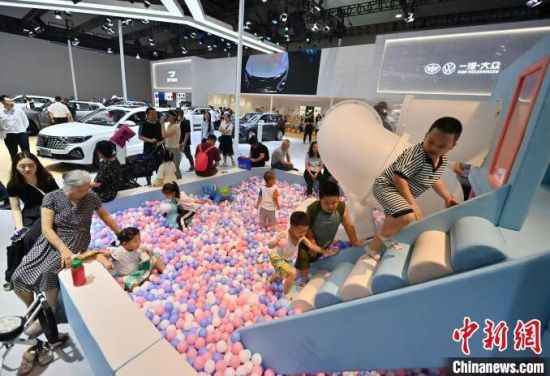 7月13日,在第21屆長春國際汽車博覽會上,小朋友在淘氣堡玩耍。本屆長春汽博會有全球124個品牌的展車亮相,現(xiàn)場設(shè)置了許多游戲體驗項目,吸引小朋友們參與。 (中新社記者 張瑤/攝)