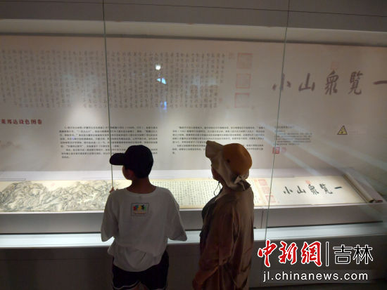 7月23日,游客在吉林長(zhǎng)春偽滿皇宮博物院參觀《〈登興安大嶺歌〉并董邦達(dá)設(shè)色圖卷》真跡。此卷是乾隆帝與詞臣畫(huà)家董邦達(dá)共同合作完成的書(shū)畫(huà)佳作,創(chuàng)作于1749年。