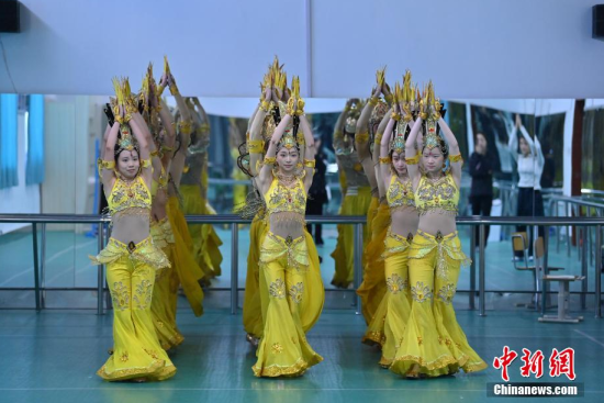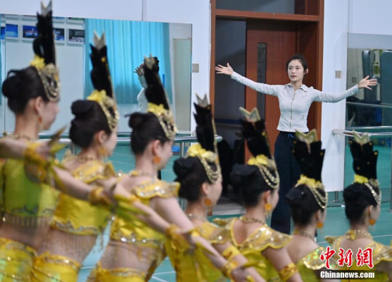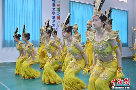 4月22日,在長(zhǎng)春大學(xué)特殊教育學(xué)院,學(xué)生們?cè)谂啪殹肚钟^音》。這所學(xué)院擁有一支由29名聽障學(xué)生組成的舞蹈團(tuán)隊(duì)。他們因?qū)ξ璧傅臒釔鄱奂谝黄穑跓o聲的世界中舞出他們精彩的人生篇章。中新社記者 張瑤/攝