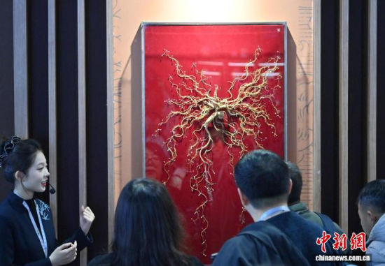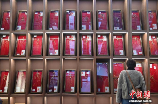 12月7日,吉林長春,參觀者在參觀人參。當(dāng)日,2025長春國際醫(yī)藥健康產(chǎn)業(yè)博覽會開幕,具有當(dāng)?shù)靥厣那暌吧絽、人參?biāo)本在人參展區(qū)展出,吸引了參觀者的目光。中新社記者 張瑤 攝