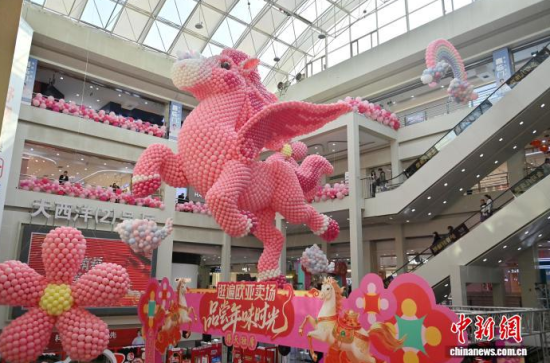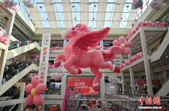 2月11日,吉林長(zhǎng)春一商場(chǎng)內(nèi)懸掛用8萬(wàn)個(gè)氣球組成的“瑞馬迎春”裝置,迎接丙午馬年春節(jié)。中新社記者 張瑤 攝