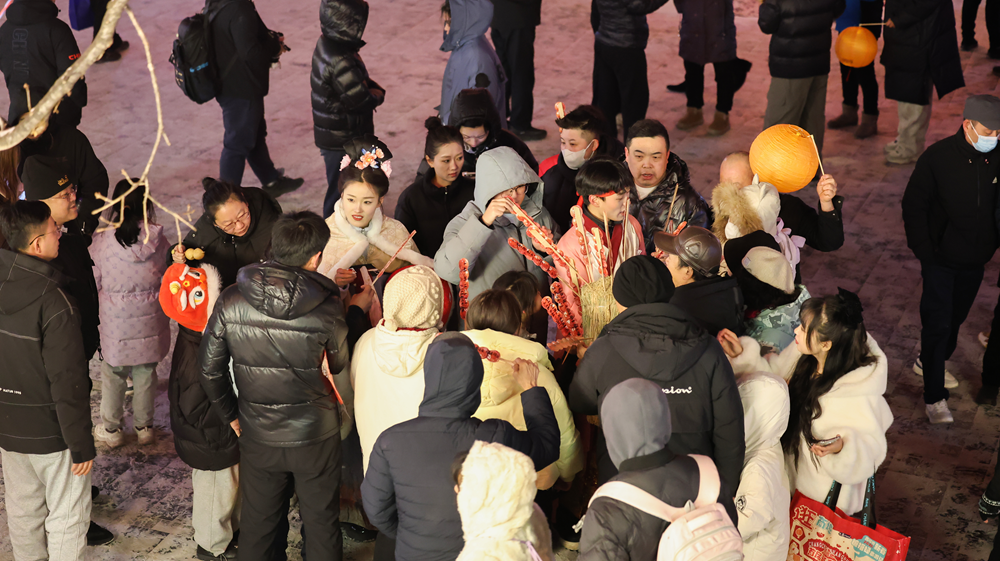 市民陳桂英是第三次走進(jìn)這片街區(qū)。74歲的她挎著相機(jī),拍下了舞龍隊(duì)伍、漢服巡游、冰雕糖葫蘆,也拍下了四海茶社門前被雪花浸白的樹枝,和游人歡樂(lè)說(shuō)笑的身影。